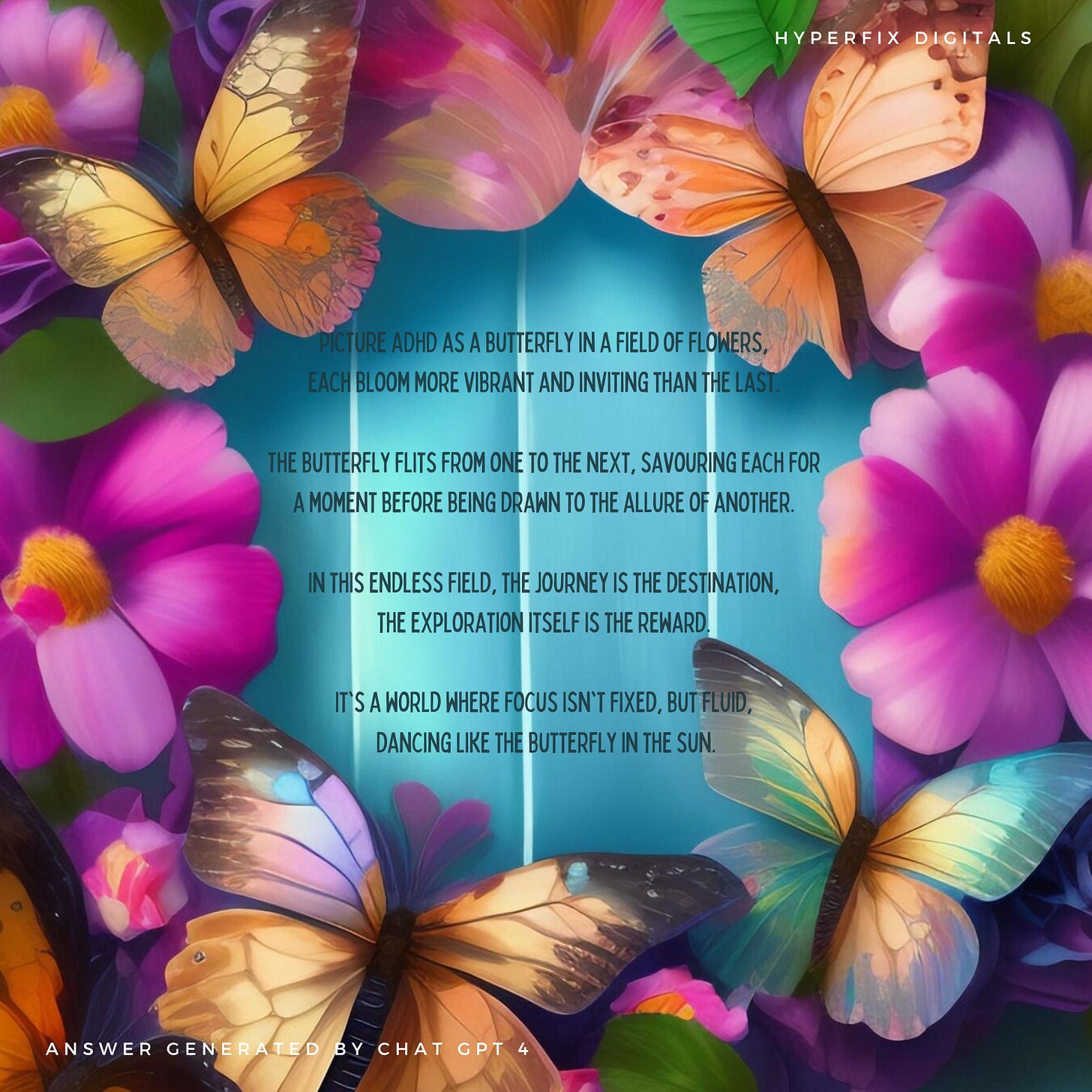 Living with ADHD means dealing with a whirlwind of thoughts, emotions, and sensations, whether it's racing down winding roads of thought, flitting from one focus to another like a butterfly, or navigating a stormy sea of distractions.